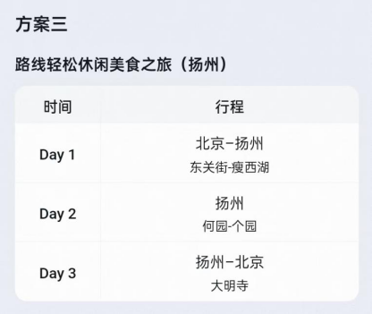 比如當AI藍媒匯將目的地確定為揚州,並讓飛豬幫忙制定幾個去揚州的旅行方案時,飛豬卻只給出了1種方案。再進一步追問後,飛豬依然只給出了一種方案。直到AI藍媒匯明確表示要給出3個去揚州旅行的方案時,這次飛豬才給出了3種方案,還對三種方案進行了綜合對比,將3種方案的優點都列了出來。