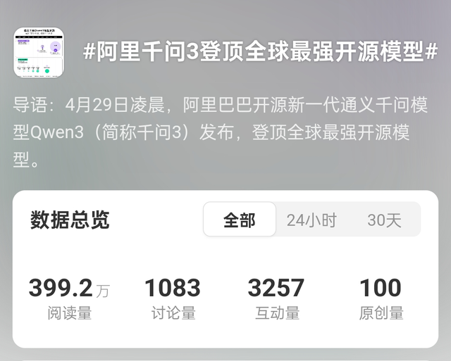 4月29日凌晨,阿里新一代通義千問模型Qwen3(簡稱千問3)開源,一發布就直接登頂全球最強開源模型。隨即相關話題引發全網關注。