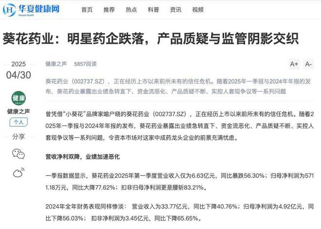 曾憑藉“小葵花”品牌家喻户曉的葵花葯業(002737.SZ),正在經歷上市以來前所未有的信任危機。隨着2025年一季報與2024年年報的發佈,葵花葯業暴露出業績急轉直下、資金流惡化、產品質疑不斷、實控人套現爭議等一系列問題,令資本市場對這家中成藥龍頭企業的前景充滿憂慮。
