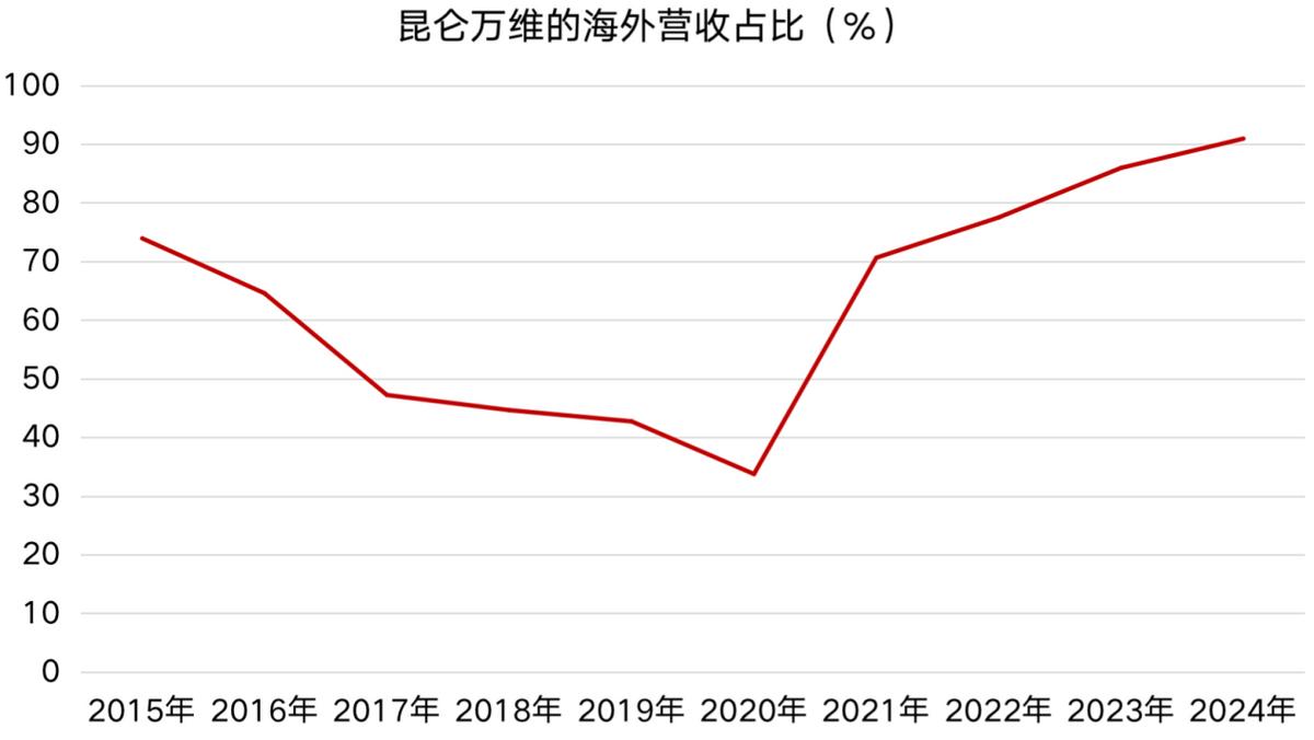 2024年年報顯示,崑崙萬維的海外收入規模增長至51.5億元,同比增長21.9%,佔總營收的比例達91.0%。