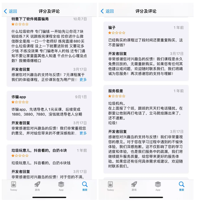 圖注:蘋果應用商店中,興趣島App的部分用户評論,吐槽誘導、騙老年入買課。