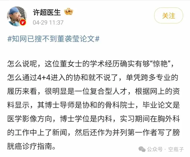 今天,大家發現,董小姐的博士畢業論文突然在知網消失了。要知道,刪掉一篇知網的論文可不是一件簡單的事,因為個人並不能自行刪除,此事大概率是協和醫學院出面了。