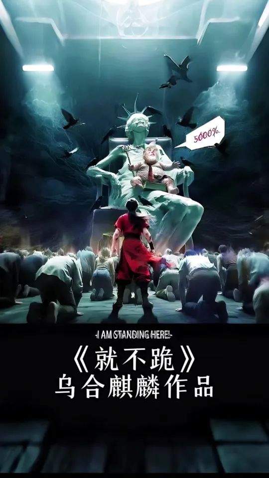 比如,一位作品經常充溢着民族情感的年輕畫家烏合麒麟,不久前推出了一幅新作《就不跪》(見下圖)。