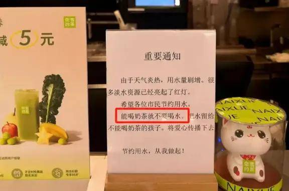 這則通知表示,由於天氣炎熱,用水量劇增,很多淡水資源已經亮起了紅燈,希望各位市民節約用水,能喝奶茶就不要喝水。把水留給不能喝奶茶的孩子,將愛心傳播下去……