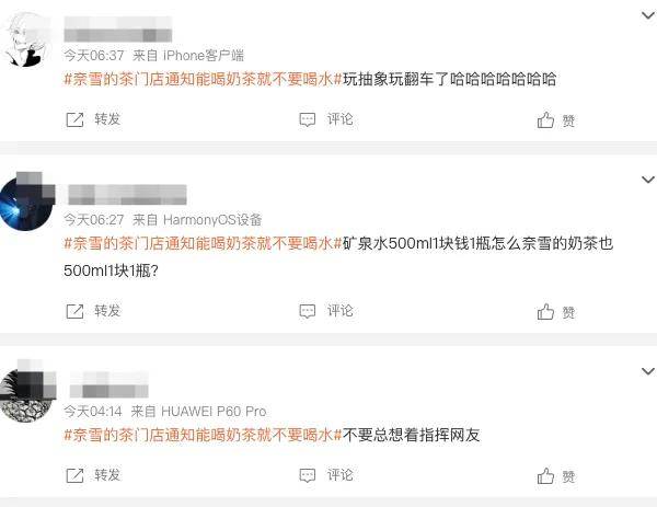 「玩抽象玩翻車了哈哈哈哈哈哈哈」「礦泉水500ml1塊錢1瓶怎麼奈雪的奶茶也500ml1塊1瓶? 」「不要總想着指揮網友 」