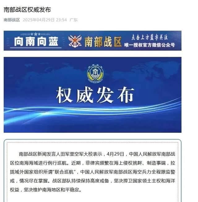 另外,中國海警再次發佈菲律賓侵闖鐵線礁證據,南部戰區南部戰區深夜發聲:情況盡在掌握!嚴厲警告菲律賓:戰區部隊持續保持高度戒備,堅決捍衞國家領土主權和海洋權益,堅決維護南海地區和平穩定。