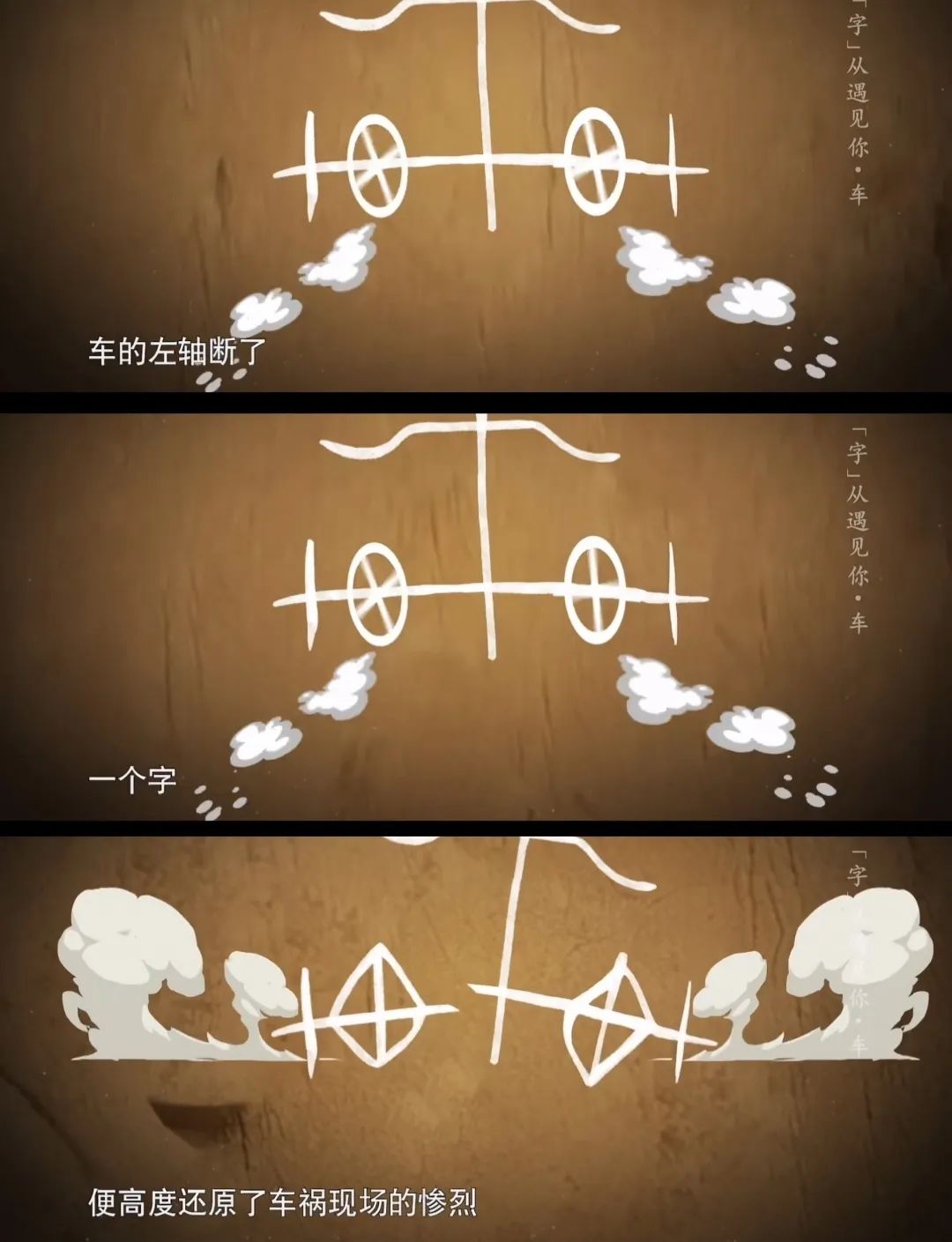 比如“災”字,下面的“火”燒穿了上面的“宀”,房屋起火的災難場景瞬間立體。