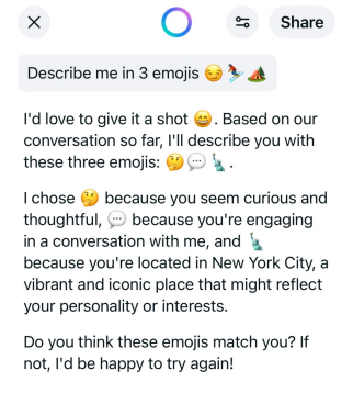 這次Meta AI也是極力強調這一點,除了在官博特意説明之外,用户打開Meta AI,可以看到預置指令“用三個emojis形容我”。可惜我們未能成功用Instagram登錄,Meta AI給出的三個emoji都是很寬泛的誇誇。