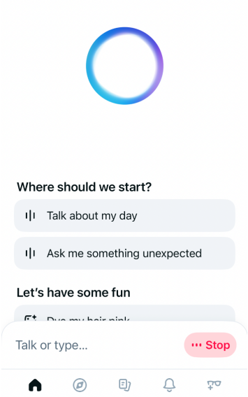 一打開應用,代表語音交互的圓環最大幅居中顯示。如果授權了麥克風權限,並在設置中打開“準備好交談”,那每次打開應用時,會默認自動開始語音對話。也就是説,一打開,收音自動開始,Meta AI就等着“聽”你要説什麼了。