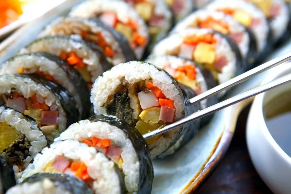 再比如源自日本壽司的紫菜包飯,韓國人捨棄了依靠壽司醋或壽司飯發酵獲取酸味、再蘸食芥末和醬油的吃法;只選取整張紫菜包裹的單一外形,並在製作過程中,就把調味用的鹽、芝麻油和芝麻包進飯糰裏;此外,或許是物產不如日本豐富,又或許受漢明文化的影響比較深,骨子裏看不起日本人的嗜食生肉,韓式紫菜包飯裏沒有生鮮肉類、魚生、魚籽,而是加入了蛋皮、胡蘿蔔、黃瓜、肉鬆、蟹柳、火腿等熟食。