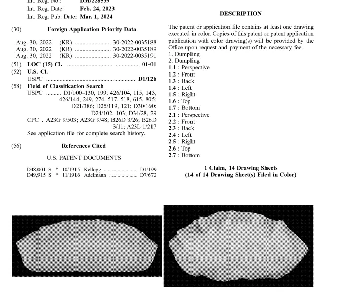 韓國速凍餃子品牌必品閣對外宣佈,他們向美國專利局申請的餃子外形專利已經獲得批准。這項專利描述專利餃子的形狀是,“底部平坦、頂部隆起的半圓形麪皮,褶皺數量在14-16道之間,呈現順時針螺旋狀收口”。