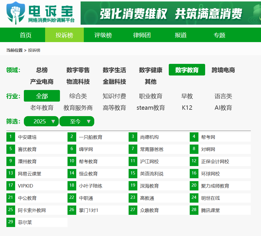 2025年至今,“電訴寶”受理投訴中涉及的數字教育領域用户有效投訴顯示(依據投訴量排行),“常青藤爸爸”排名第7位。最新評級為“不予評級”。除此之外,其他被投訴的類似平台還有:中安建培、一隻船教育、尚德機構、幫考網、賽優教育、嗨學網、常青藤爸爸、對啊網、潭州教育、幫考教育、滬江網校、正保會計網校、網易雲課堂、恆企教育、英語流利説、環球網校、VIPKID、小葉子陪練、深海教育、聚力成師教育、中公教育、中職通、高教通、明世在線、阿卡索外教網、掌門1對1、眾趣教育、騰訊課堂、菲爾萊。