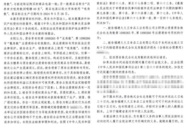 根據法院審理,福建久久王食品工業有限公司這種“僅改首字”的近似產品標識,足以讓消費者產生混淆,已構成商標侵權。最終,福建久久王食品工業有限公司被判令停止商標侵權行為並向龍角散賠償相應損失。