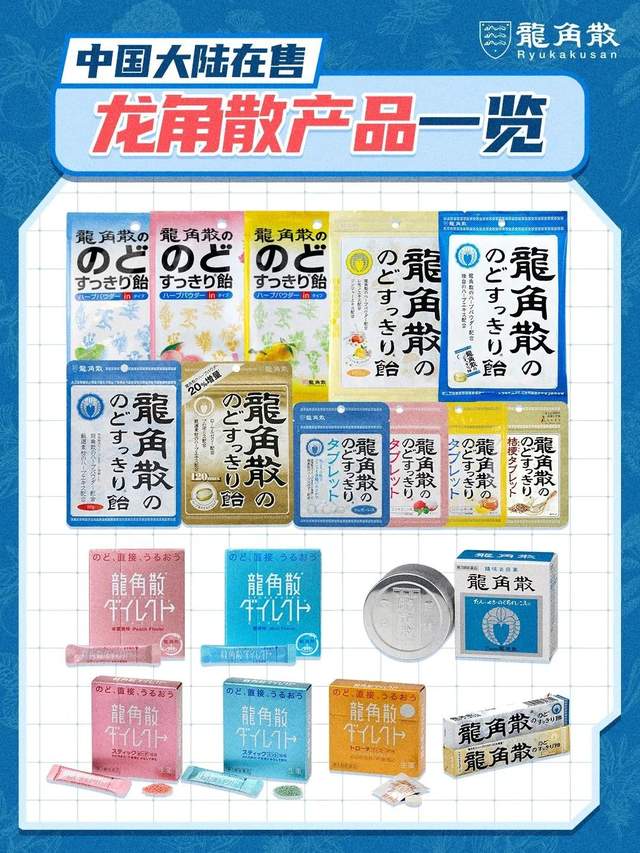 如今,龍角散已成功研發出了從傳統散劑到免水潤顆粒&含片等OTC產品、龍角散潤喉糖、無糖潤喉片、龍角散顆粒糖等日常清潤產品,乃至幫助人們更好吞嚥的吞嚥輔助果凍等在內的全系列、多樣化的咽喉護理產品,覆蓋各類咽喉護理場景,全方位滿足消費者多元化護嗓需求。