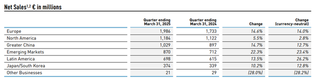 報告顯示,2025年一季度,斯凱奇美洲增長8.3%,歐洲、中東及非洲(EMEA)增長14.4%,而亞太地區下滑了2.6%,營收比重也被EMEA地區反超。被視為國際市場上重要增長引擎的中國市場,期內營收同比下滑15.9%,增速明顯低於預期。