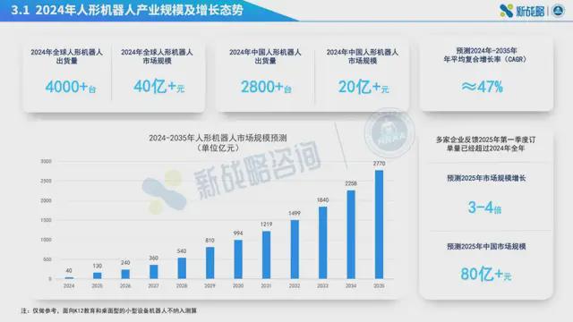 在產業規模方面,2024年全球人形機器人(面向K12教育和桌面型的小型設備機器人不納入測算)出貨量超過4000台,市場規模超過40億元。其中,中國人形機器人出貨量超過2800台,市場規模超過20億元。此外,多家企業反饋2025年第一季度訂單量已經超過2024年全年,且有多家企業發佈了量產百台、甚至千台以上的量產計劃,因此,預測2025年的市場規模將增長3-4倍,到達80億+元的區間。