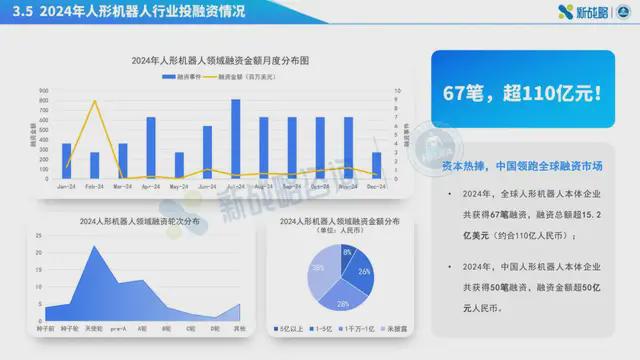 在投融資方面,2024年,全球人形機器人本體企業共獲得超67筆融資,融資總額超過15.2億美元,約合110億人民幣。中國人形機器人企業共獲得超50筆融資,融資金額超50億元人民幣。2025年第一季度全球共發生超35起人形機器人領域的融資事件,融資總額超過80億元人民幣。中國市場尤為活躍,融資事件超過30筆,總額突破40億元,融資金額佔據全球的一半以上。預計2025年的融資金額將超過去年。