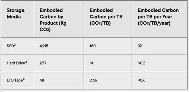 報告對三種主流存儲介質的“碳足跡”(Embodied Carbon)進行了比較,結果如下: