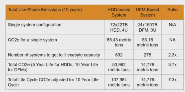 Pure測算的數據顯示,部署1EB存儲容量並且用上10年的話,基於SSD的DFM(DirectFlash Module,是PureStorage自研企業級閃存模塊)系統,與基於HDD的系統相比,整體碳排放低7.3倍。