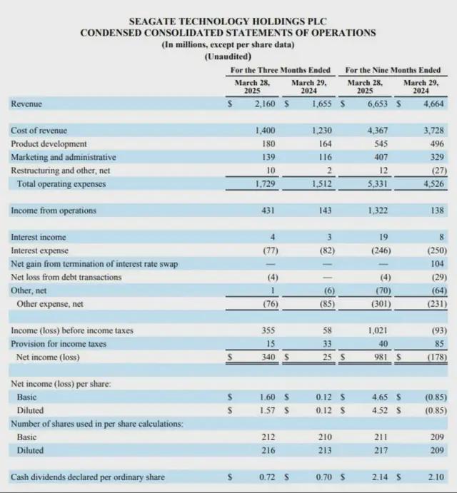 根據希捷於4月29日美股盤後公佈的財報,2025會計年度第三季(截至2025年3月28日),營收強勁年增30.5%至21.6億美元,擊敗LSEG統整分析師預期的21.2億美元;淨利3.4億美元,即每股盈餘1.57美元,遠優於去年同期淨利2,500萬美元,即每股盈餘0.12美元。