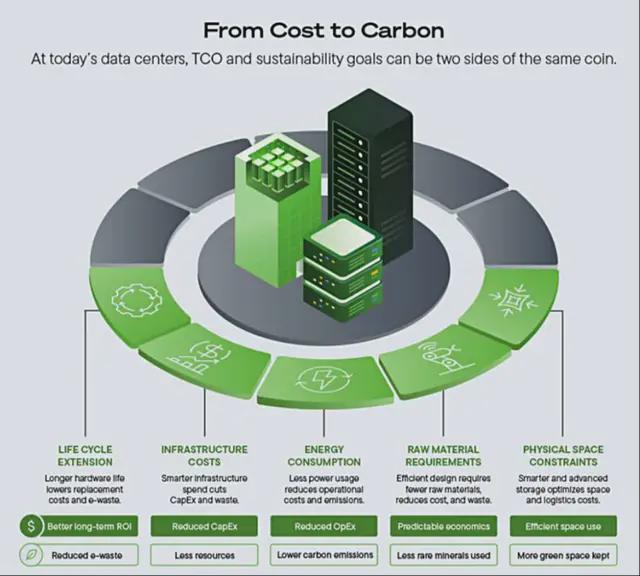 報告引用了高盛的預測,即到2030 年,全球數據中心的電力需求將比2023 年增長 165%。考慮到這一點,報告表示,數據量的增加、電力效率提升的放緩以及人工智能的普及,正在給企業帶來壓力,要求他們同時管理碳排放、基礎設施擴張和總擁有成本 (TCO)。