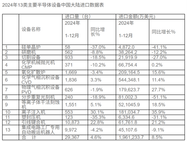 今年2月,海關統計數據在線查詢平台公佈了2024年13類主要半導體設備進口29367台,同比增加4.6%,進口金額196.12億美元,同比增長8.5%。