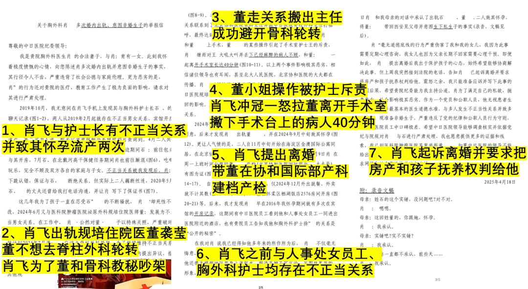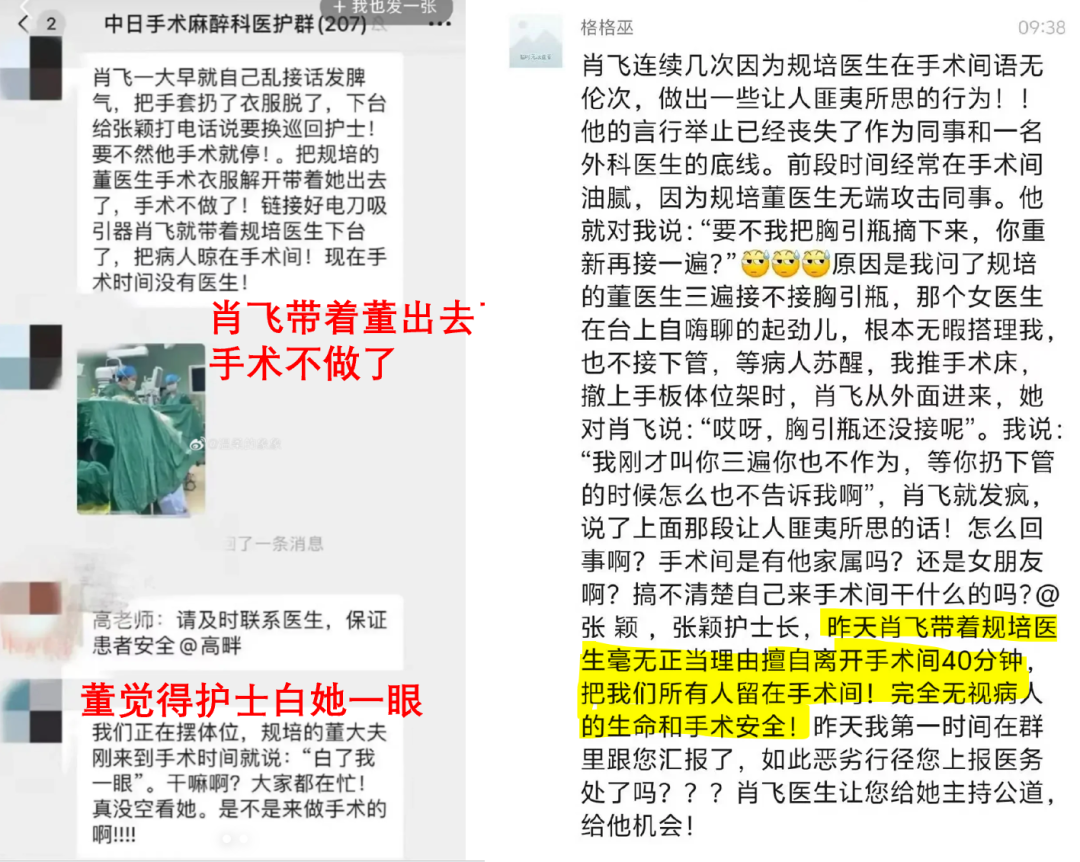 起因是中日友好醫院肖飛的妻子遞交了一封舉報信,裏面詳列了肖飛婚後出軌多名女性、出軌規培醫生董襲瑩、幫董在醫院違規操作、拉着董離開手術室扔下手術枱上的病人40分鐘等惡劣事件。