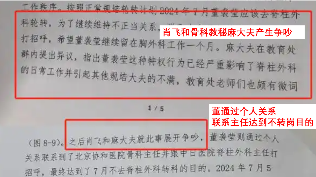 3、董醫生的超強醫院特權畢業後,董醫生又在醫院享受超強特權。根據舉報內容,她本來應該從胸外科轉到脊柱外科,但不想轉。於是肖飛醫生和骨科教秘打招呼,被拒。她又通過個人關係,聯繫了兩位主任達到目的。這背景和實力,令人歎為觀止!