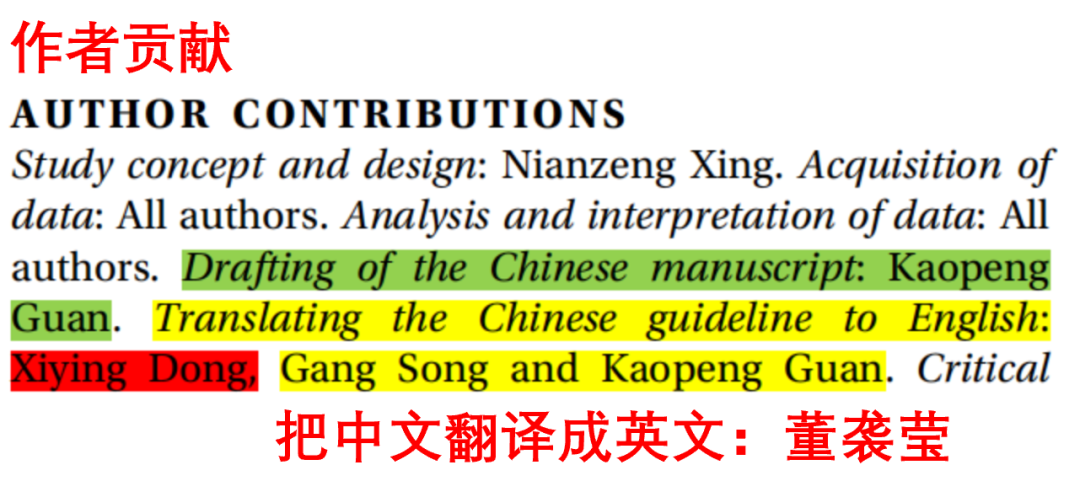 凡是寫過論文的,都明白一作在眾多作者中的份量!那董具體做了什麼呢?作者貢獻部分寫的是,董承擔了翻譯工作,甚至她的翻譯還不是獨立完成的,後面還跟着倆人…