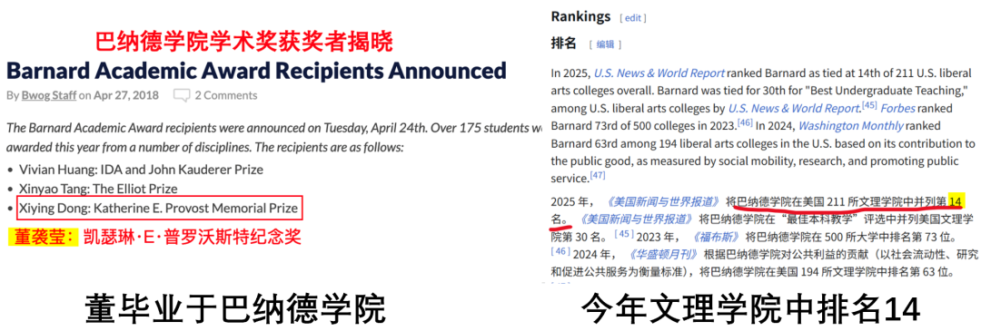 董襲瑩的本科是哥倫比亞大學巴納德學院經濟學專業。哥大確實是世界頂級名校,巴納德學院也是哥大旗下的學院。網上有説這是三本野雞學院,但我查了下它在全美211所文理學院的排名第14名,其實也不錯的。但招生門檻確實低於哥大主校,不能以哥概全。
