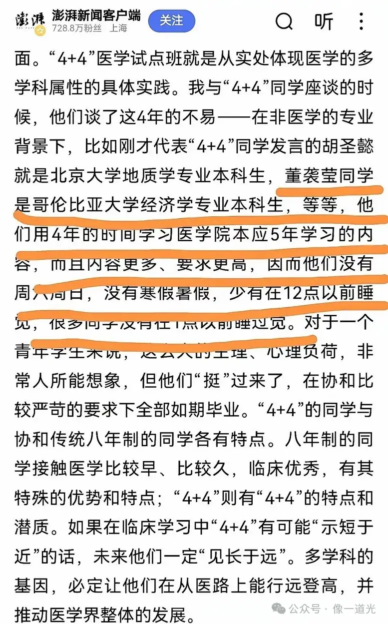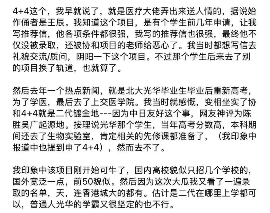 另外強調一點,中國4+4項目並非王辰首創,它始於浙江大學醫學院從2005年起創辦的巴德年醫學班(前4年攻讀非醫學本科專業,後4年進入醫學博士培養階段),但浙大巴德年醫學班的招生對象是高考生,考分與清北相當。王辰院士的開創之處在於,錄取過程採用的是申請+推薦制,這中間的操作空間就大了。
