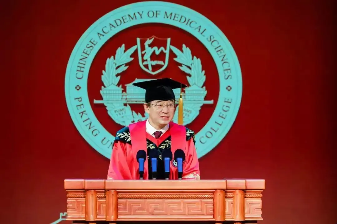 王辰院士穿着學位服,出現在北京協和醫學院2023屆畢業典禮上。這是特殊定製的學術禮儀服裝,黑色博士學位帽搭配着黃色垂穗,紅色長袍不同於國際通用的綠色醫學象徵,其中的刺繡紋樣更帶有東方院校特色。