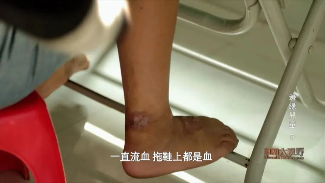 我走路時腳會一直流血,拖鞋上都是血,很難受。孩子們不和我玩,他們嘲笑我,給我取外號,讓我很傷心。