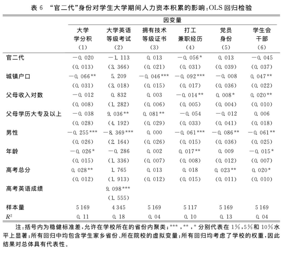**基於迴歸結果,我們發現“官二代”與普通同學在學習成績、獲得技術等級證書方面不分伯仲,但是他們的打工兼職 (包括實習)經歷更少。**表6第1列的迴歸以學分積為因變量,自變量與之前保持一致。“官二代”虛擬變量前的係數小且不顯著,這表明“官二代”在學習成績上沒有優勢。英語對大學生而言很重要,所以我們也以全國英語等級考試成績為因變量進行了迴歸。雖然之前的簡單統計顯示“官二代”的英語成績更高,但是表6顯示,在控制其他因素的影響之後,“官二代”在英語方面沒有優勢(第(2)列)。同時他們獲得技術等級證書的幾率與普通同學相同(第(3)列),但是在校期間從事兼職工作的可能性更小(第(4)列)。