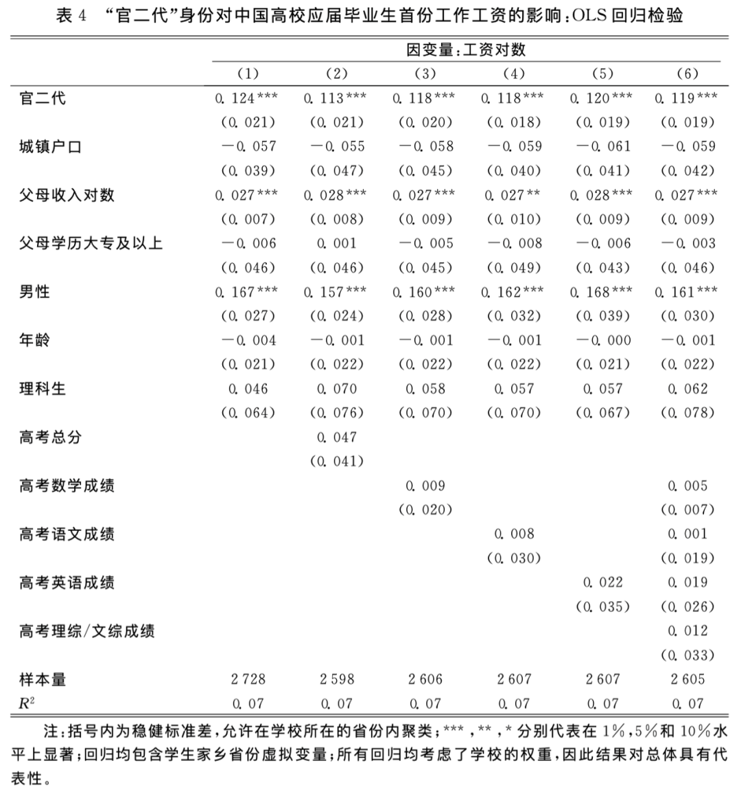 “官二代”在高考中表現更好。表3的第 (2)—(6)列中,我們分別以高考總分、數學、語文、英語和理/文綜成績作為因變量進行迴歸。**“官二代”高考總分、數學成績更高,但是另外幾科成績與普通大學生不分伯仲。**以上結果表明,在工資方程中引入高考成績作為控制變量是非常有必要的。