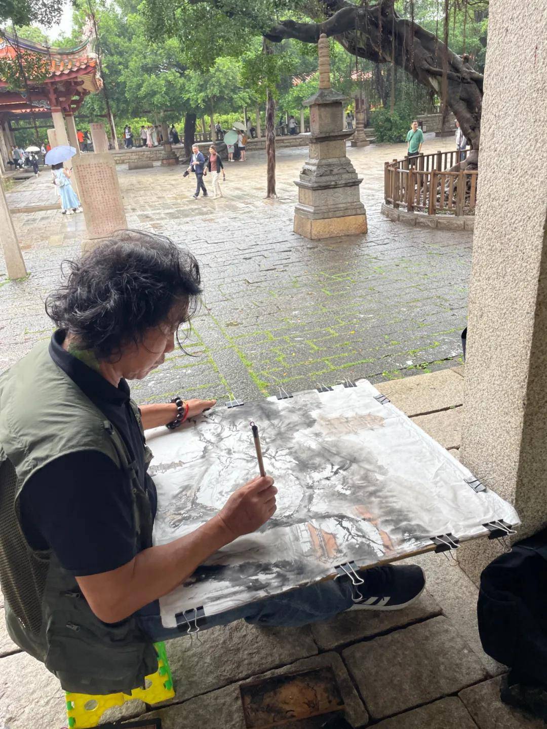 作為海上絲綢之路起點,泉州在周波畫中展現出獨特的文化摺疊。開元寺雙塔的飛檐與清淨寺的穹頂遙相輝映,宋元商船桅杆刺破天際線,而古街巷裏,傳統南音的婉轉曲調與街邊特色茶館中飄出的茶香相互交融。這種時空並置暗合湯顯祖“航通萬國商”的詩意,更以“線”為容器——如同歷代名家在諸多描繪古城風貌的畫作中用線條串聯起歷史記憶與當下景象一般——周波用墨線勾勒出刺桐城的多元基因:宗教的肅穆、商貿的喧囂、市井的温情,在“光明之城”的命題下達成和解。
