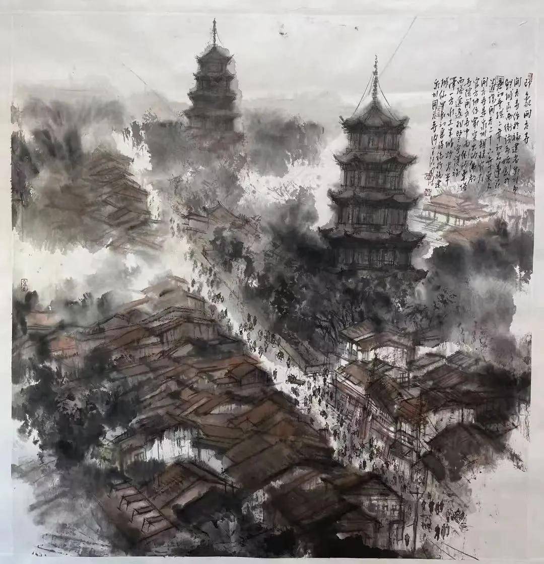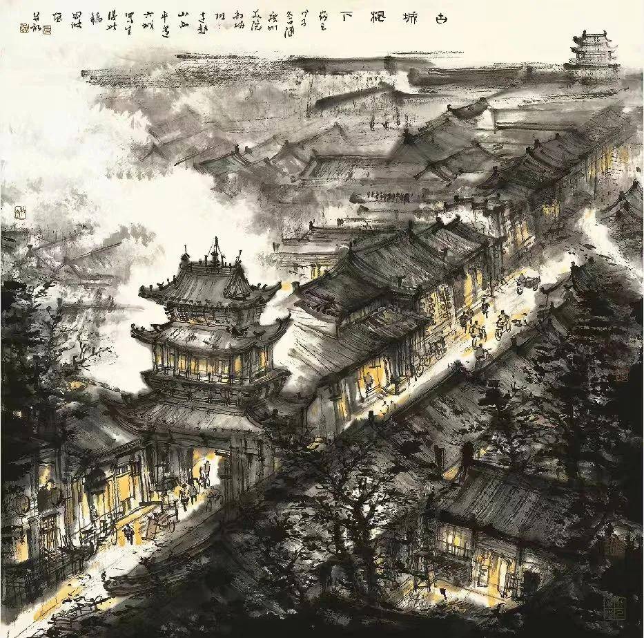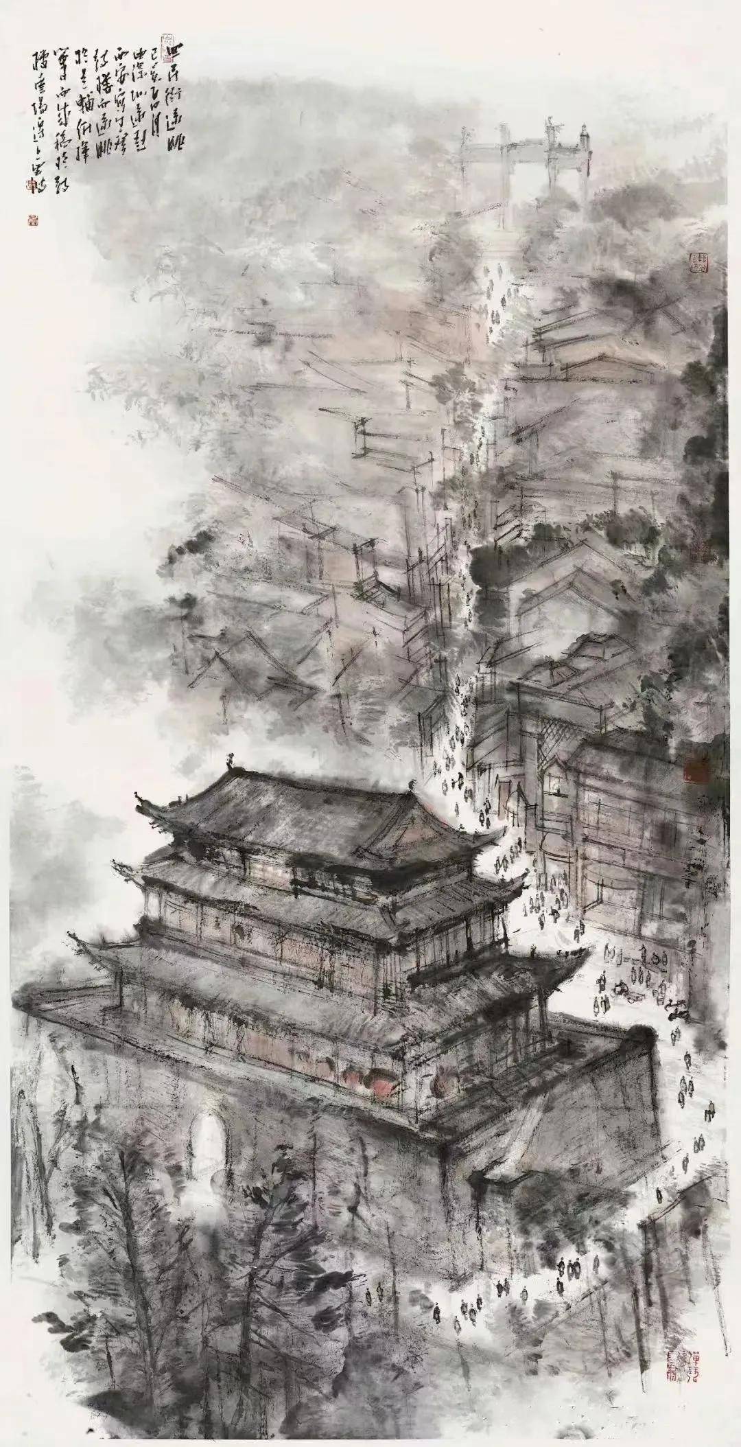 周波的“大景大觀”古城系列,既是對郭熙“三遠法”的當代回應,亦是對全球化語境下文化認同危機的藝術解答。當平遙通過“又見平遙”大型實景演藝實現文旅突圍,當泉州因“宋元中國的世界海洋商貿中心”申遺成功重煥生機,周波以畫筆證明:古城不是標本,而是活的有機體。其時空重構的創作觀,暗含錢鍾書所言“理之在詩,如水中鹽、蜜中花”——歷史與現代、本土與異域、形而下與形而上,在墨色交融中達成美學統一。這種“大景大觀”視角下的藝術實踐,不僅為古城保護的必要性提供視覺範本,更啓示我們:真正的文化傳承,需在時空對話中尋找“創造性轉化”的文化密碼。