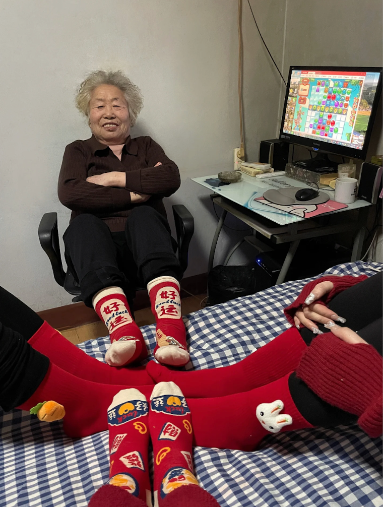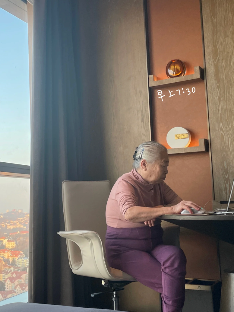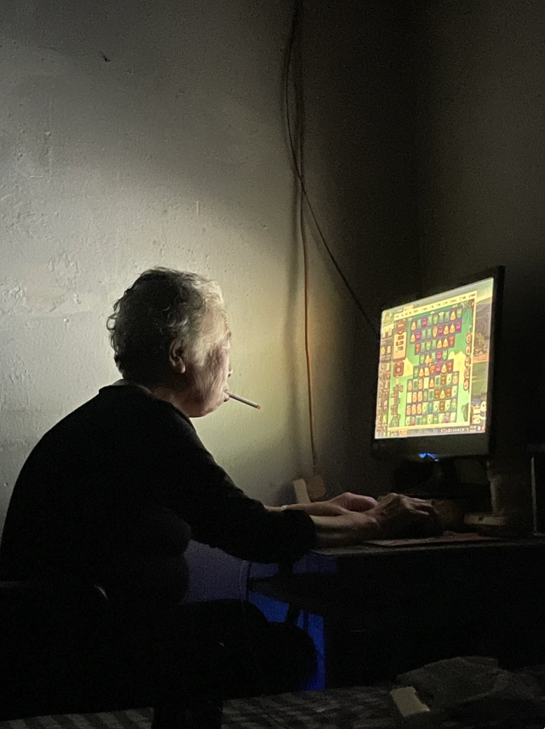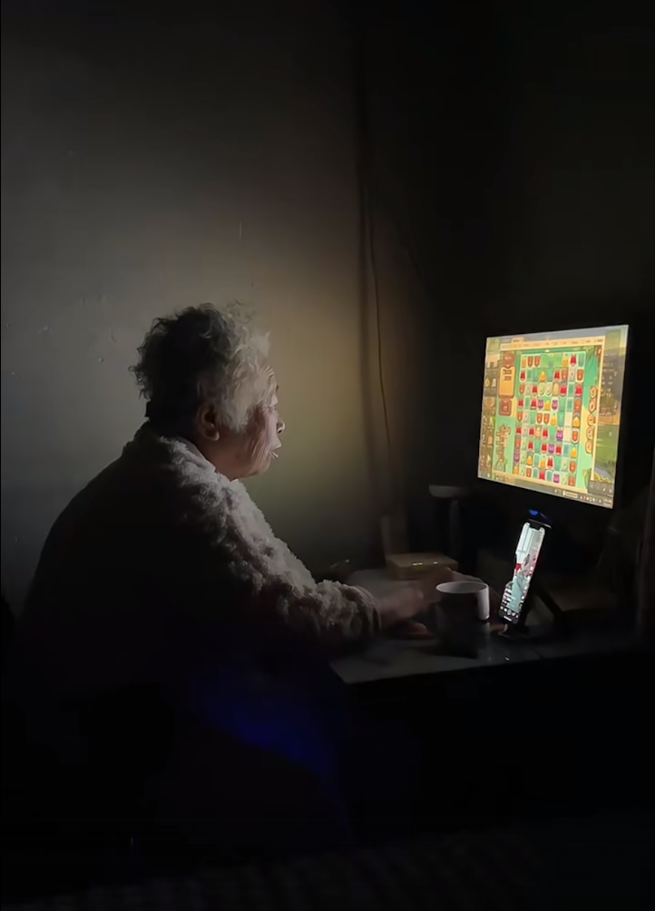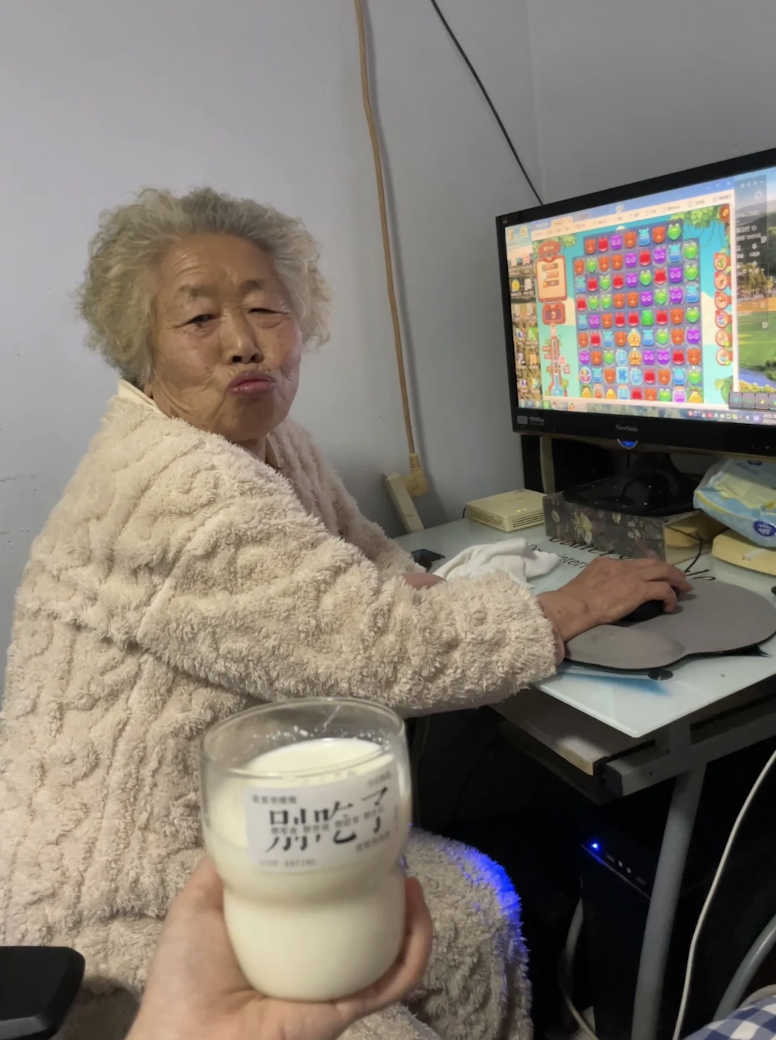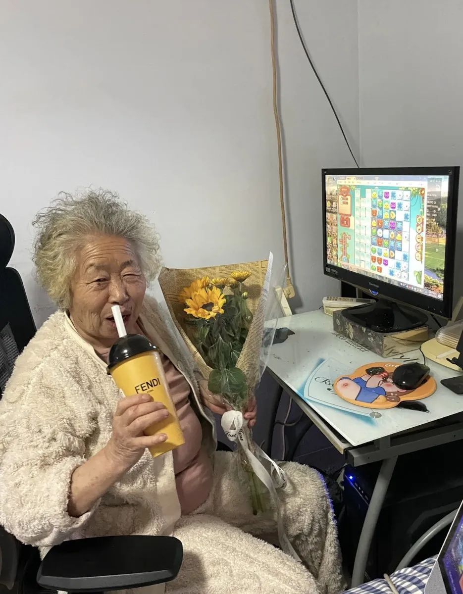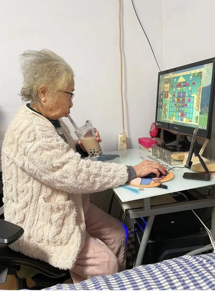 奶奶阿珍左手握着奶茶杯,右手拖動鼠標,喝奶茶的同時,眼睛還不忘盯着電腦屏幕裏開心消消樂的遊戲關卡看,“unbelievable!”的遊戲音效在房間裏此起彼伏。