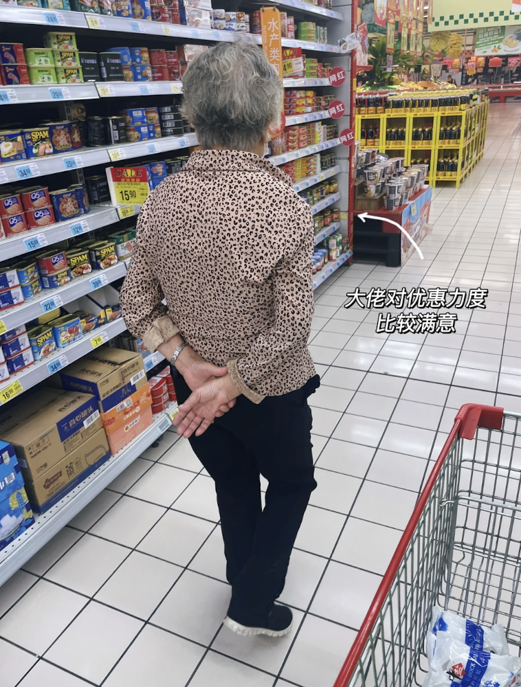 阿珍揹着手跟小柒逛超市