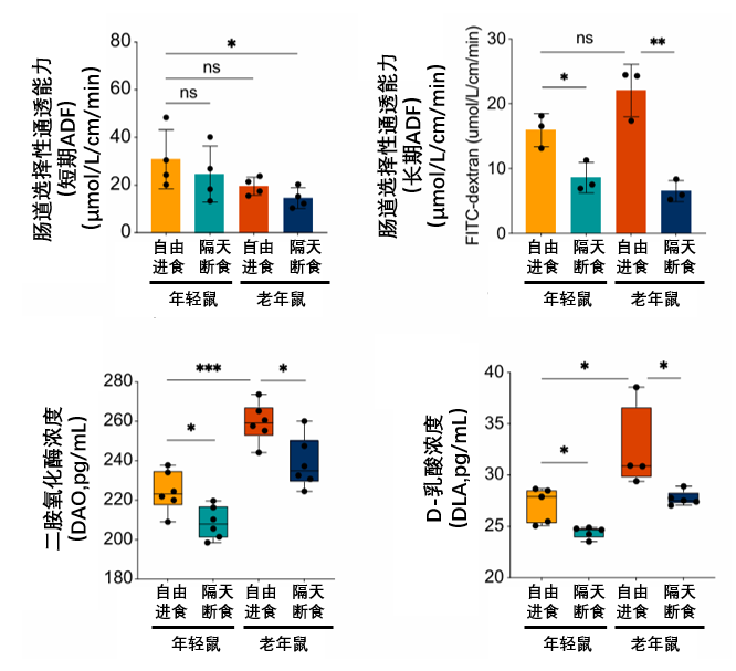 來到ADF的最後一個好處:加固腸道屏障。以長期ADF為例,它能降低衰老小鼠小腸對FITC-葡聚糖的通透性,改善腸道屏障的完整性。同時,代表腸道損傷的血清標誌物(DAO、DLA)濃度也開始降低,表明黏膜損傷在恢復。