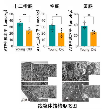 不僅數量減少,衰退的線粒體,結構更是存在明顯異常:其形態趨向於圓形化,內部嵴結構紊亂,生產ATP的效率大大降低(衰老小鼠十二指腸、空腸、迴腸上皮細胞中的ATP生成水平相比對照低了30%~40%)。