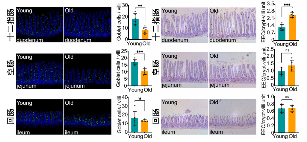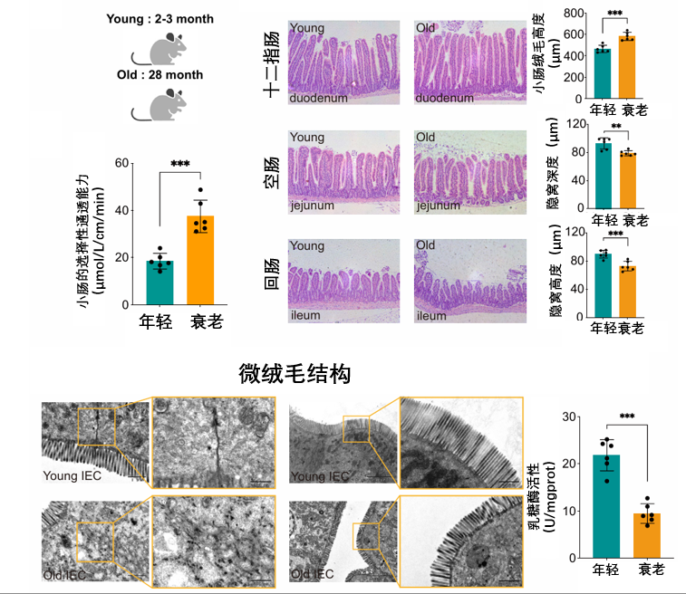 圖注:選用2-3個月的小鼠(年輕組)和28個月的小鼠(衰老組),發現衰老組的腸道結構功能出現變化
