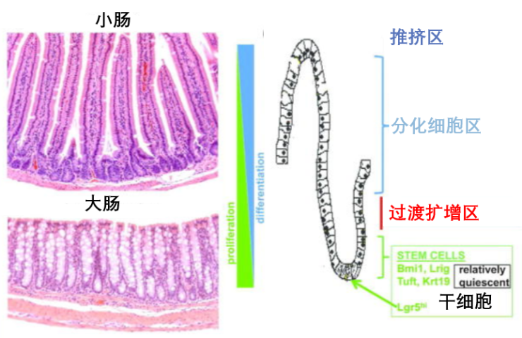 腸道幹細胞是維持腸道健康和功能的關鍵細胞,它位於腸隱窩底部,能分化成不同的腸道功能細胞,向上面表皮輸送,比如負責消化吸收的吸收性腸細胞,分泌黏液用作物理屏障的杯狀細胞等等[2]。