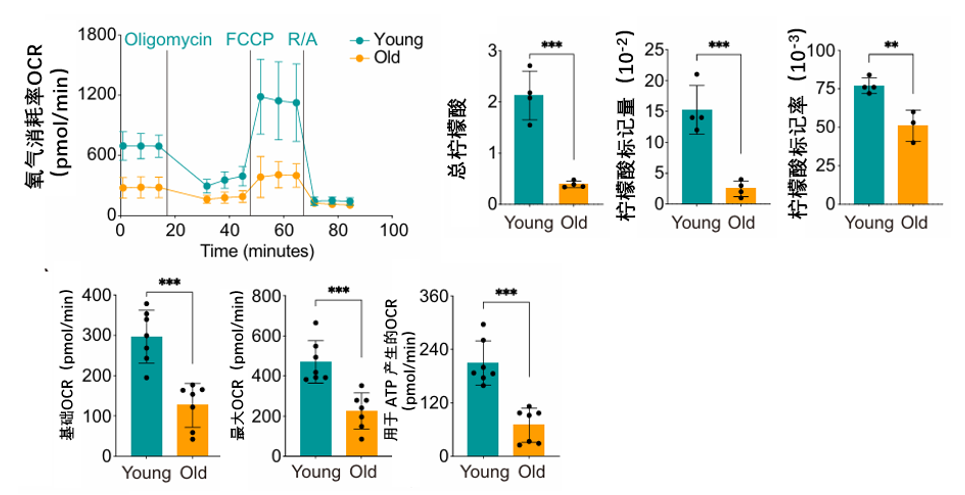 除了數量和結構的問題,更麻煩的是,衰退的線粒體還拖累了小鼠的核心代謝能力。老年小鼠的氧氣消耗率(OCR,氧化磷酸化能力的表現)以及總檸檬酸濃度和檸檬酸標記率(脂肪酸氧化能力)也開始走下坡路。