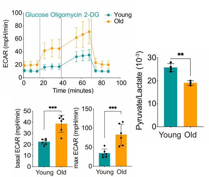 ……兩條供能路線同時歇菜?不過還有另一個信號:衰老小鼠的ISC中,細胞外酸化率(ECAR)升高,丙酮酸/乳酸比率降低,細胞的代謝方式正被迫出現轉變——從依賴氧化磷酸化變為依賴糖酵解(總算來救星了?)。