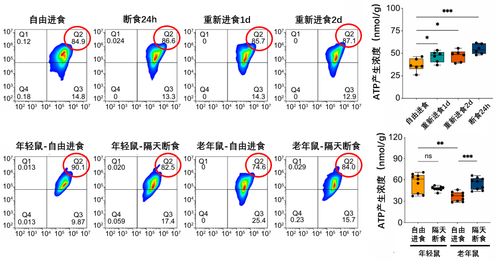 數據説話!**無論是短期(一個24小時的禁食期),還是長期(8周)的ADF,都能有效提升小鼠ATP的產生水平。**還有一點,長期ADF的老年小鼠,有更高比例的ISC細胞具有高線粒體膜電位,線粒體活性增強。