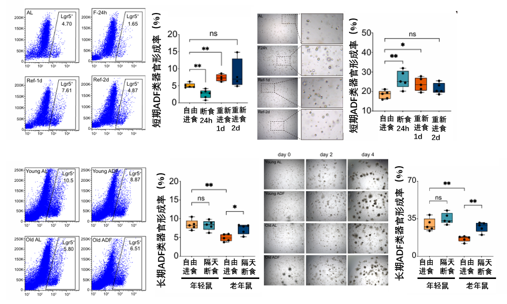 一個最重要的點,不管長短,小鼠形成類器官的能力(再生能力)均得到提升。不過在細節上有點小區別,短期ADF會因為身體應激反應,腸道幹細胞數量出現減少現象。但只要堅持下來,長期ADF可會帶來豐厚回報:恢復老年腸道幹細胞的數量。