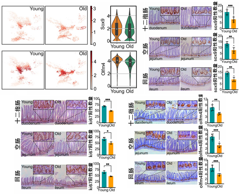 結果發現在這些衰老小鼠的腸道里,代表幹細胞身份的標記基因(Sox9、Olfm4)表達量開始降低,幹細胞數量開始減少。不僅如此,小鼠的十二指腸、空腸和迴腸中的Ki67+細胞(增殖標記物)數量也跟着縮水,幹細胞增殖活力、分化功能大打折扣。
