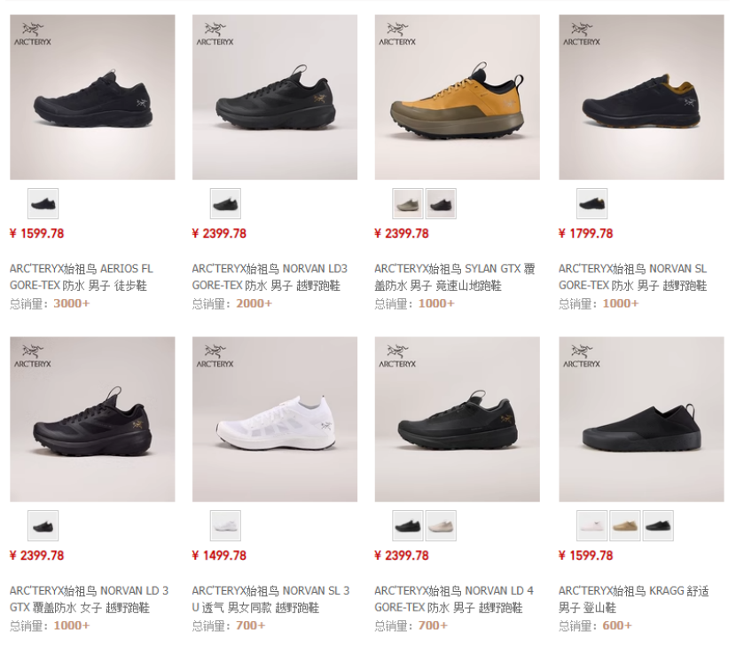 據源Sight瞭解,始祖鳥户外鞋的價格基本在1500-3800元之間,熱銷款式集中在1500-2600元區間。在品牌天貓旗艦店內,其熱銷第一的休閒鞋RALLE LEATHER 2售價約為2600元;越野鞋NORVAN LD3 GTX款售價約為2400元;登山鞋AERIOS FL GTX款售價約為1600元。