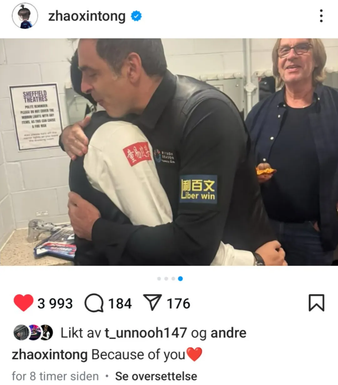 當趙心童贏下比賽後,他用雙手和奧沙利文握手的方式表達了對亦師亦友的對手的敬意